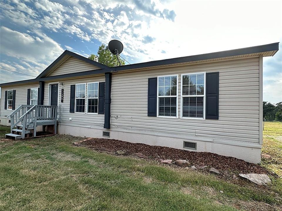 Country Living with beautiful 3 bedroom 2 bathroom home with office/4th bedroom on 1.9 acres (MOL). Enter the home on a wooden stair deck into a large open living area with large dining and large kitchen. The kitchen has an island, lots of cabinet and counter space, and room to prep and serve family/friends. Just to the right is a large master bedroom with large master bathroom and walk-in closet. The bathroom has a garden tub and shower along with a nice long vanity. To the left of living area is a nice full-sized office with closet that could be a 4th bedroom and a hallway entrance leading to the second bathroom and 2 large bedrooms. Through the dining area french doors lead out to a partial covered wood deck with room for lot of chairs and a grill to watch wildlife and the Oklahoma changing seasons. The acreage has an open fenced area to run livestock for a small farm.