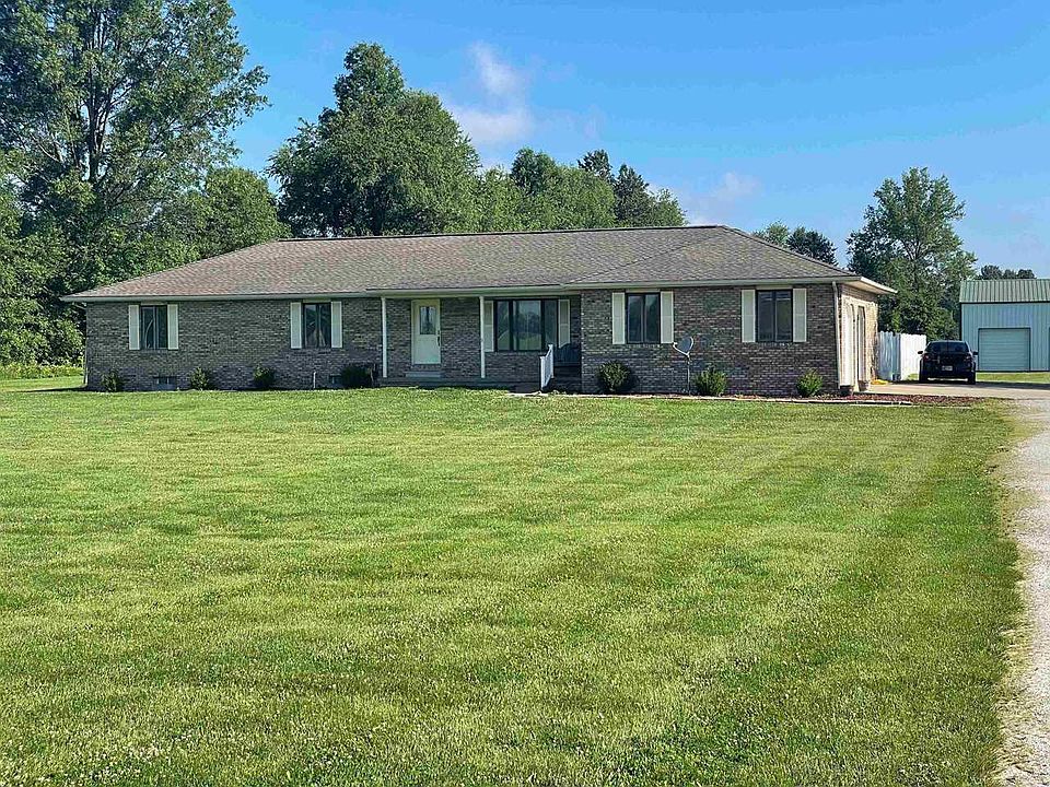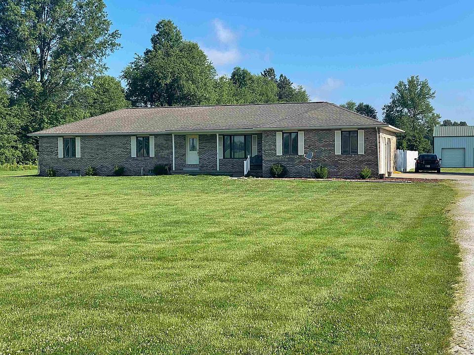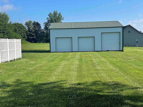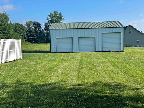 This 1992 SF energy efficient home is on 3.12 acres at the edge of town. It boasts 3 beds and 3 full baths on the main floor. It has an 1800 SF unfinished basement, with 9 ft ceilings that is just waiting for you to put your finishing touches on it. Open Concept Living, Dining & Kitchen. Kitchen has beautiful custom built cherry cabinets with granite counter tops, ceramic tile flooring and a built in island island. Stainless Steel Kitchen appliances included in sale, to include a new dishwasher. The Main bedroom has a huge walk in closet, and an EnSuite full bath with tile floor, granite counter tops. There are doors off the master that lead to the back deck where the hot tub is located. There is a 2nd full bath between the other two bedrooms. The spacious laundry room/mud room includes a 2 person Sauna, with washer and dryer hookups. There is a 3rd full bath off the laundry room. The home includes a 2 car attached garage that enters into the laundry area and a 3 car detached metal pole barn building. The back yard is a large fenced in area with white vinyl fence and behind the fence is what I would consider pasture area, that is not currently mowed as frequently.