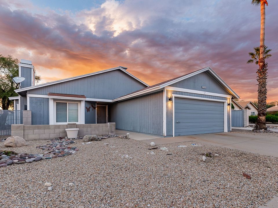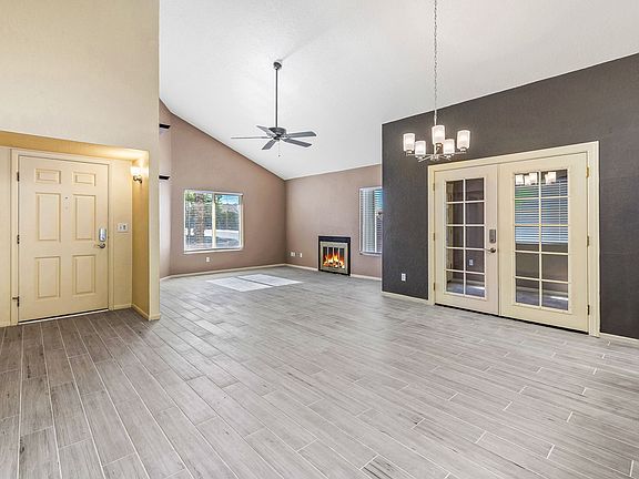 This home has it all in a quiet and convenient eastside community. New carpets, paint, lighting, and tile flooring throughout. Huge vaulted ceiling open floor plan with lots of light streaming in from skylights in the great room and an open sunroom with double French doors. Enter into the large yard off the sunroom or back sliding door and enjoy the quiet of a secluded yard. Relax near the outdoor fire pit or indoor fireplace while doing a load of laundry in the front load high capacity washer and dryer included for use. On warm days, take advantage of the community pool, clubhouse, playground and park immediately across the street. Or relax at home with ceiling fans throughout with central A/C and central heat. Completely renovated interior on 10/2025 with new paint, new tile flooring and new carpeting in all bedrooms. Large double gate with additional parking.