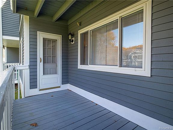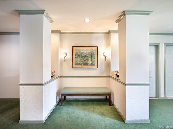 No steps into this beautifully remodeled 5 room, 2 bedroom, 2 bath ranch condo overlooking an expansive lawn. Foyer with walk in closet, remodeled kitchen with rich oak cabinets, Corian counters & pantry, dining room with door to balcony, living room has fireplace with custom mantel, master bedroom has walk in closet, wall to wall carpet, full bath with stall shower & Corian counter, bedroom has wall to wall carpet with 2 double closets. Hall bath with tub with shower & Corian vanity. Custom crown molding, engineered wood floors, updated windows, six panel doors & updated light fixtures. Storage in Bldg 103. This affordable complex is convenient to shopping, library, Wolfe Park, golf course and is an easy commute to upper & lower Fairfield County & New Haven County in a peaceful country setting.