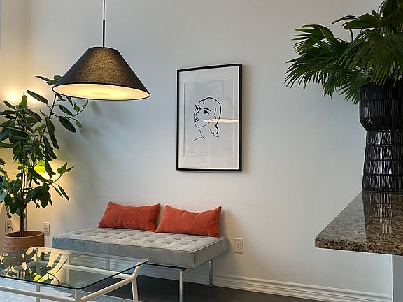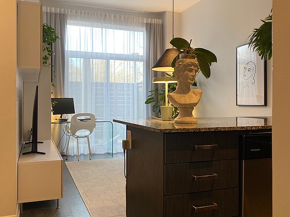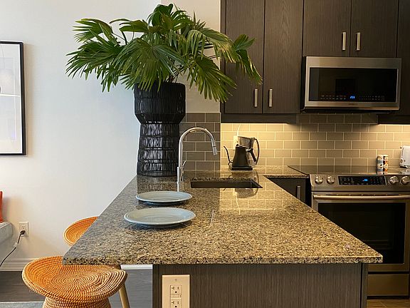 Welcome to the luxurious one-bedroom unit with a spacious (over 3m x 7m) terrace at Bristol Condo! This stunning residence boasts a bedroom with walk-in closet, a large bathroom with lots of storage space, impressive 10ft ceilings, and laminate floors. Located on the first floor next to the concierge/security you are safe, avoid all the condo's elevator traffic, and have easy access to the outdoors. With the terrace, you have exclusive rights to have a barbeque outside. Enjoy the convenience of an ensuite washer and dryer, kitchen LED valance lighting, upgraded kitchen appliances, and granite counters. Included furnishings like a sleek TV wall unit in the living/dining room, a cosy bed, curtains, and designer light fixtures to elevate the living experience. Close to stores, public transit and schools, minutes to Hwy 404. Don't miss the opportunity to make this sophisticated space your new home. Extras: An ensuite washer/dryer, kitchen LED valance lighting, s/s range, microwave above the range with fan, dishwasher, fridge. TV wall unit in the living/dining room, the bed, curtains in living room and bedroom, designer light fixtures. Exclusions: Absolutely NO SMOKING. Tenant to set up Account with "Metergy Solutions" for Hydro and Water payments. $300 Key Deposit required (refundable at the end of the Lease), Tenant Insurance must be purchased upon Closing. Property Includes a storage unit and one indoor garage parking spot. No smoking allowed. Renter is responsible for their own hydro bill (Metergy). Standard first and last month rent required upon signing.