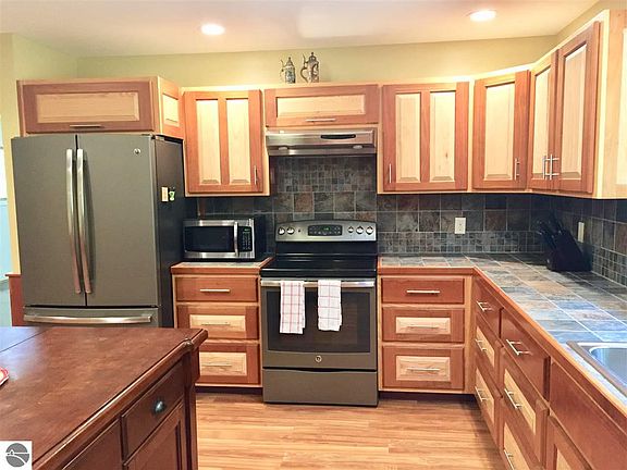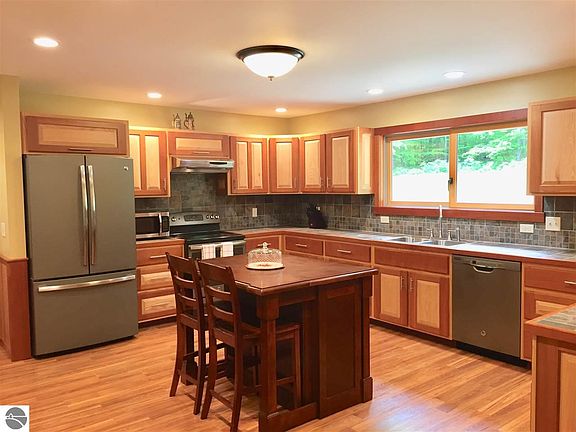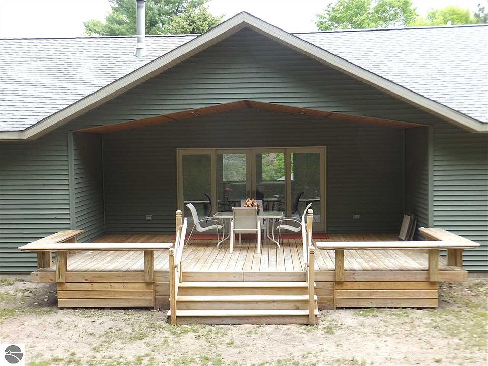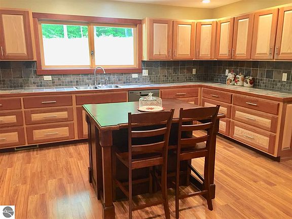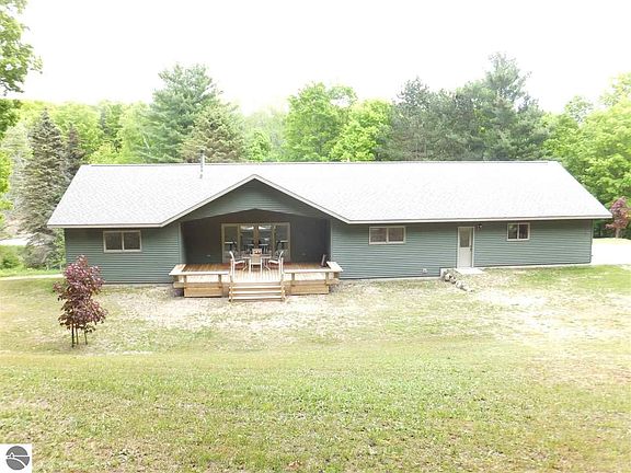 This meticulously maintained three bedroom/2.5 bath home features main floor living, custom kitchen with tiled counter tops and cherry/ oak wood cabinets and stainless appliances. A great room with vaulted ceilings, hardwoods floors and a wood stove for chilly evenings. A large master bedroom with walk-in closet and master bath, all in ceramic tile and cherry cabinets. A large covered deck off the dining room added for family barbecue's or morning coffee while enjoying the outdoors and wild life. Over sized attached, heated garage, large insulated pole barn and a she shed to keep the Mrs. happy. All this on 2.5 acres with close proximity to Frankfort and lake Michigan or Beulah and Crystal Lake. Come and experience this quality built home and enjoy the up North life close to hiking trails, biking, fishing and Sleeping Bear Lake shore.