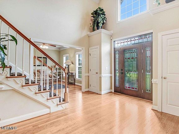 Welcome to your dream home! This stunning all brick residence on 1.04 acres offers both beauty and functionality. The backyard, fully fenced and equipped with an irrigation system, features grape vines, blueberry bushes, and fruit trees, perfect for outdoor enjoyment. As you enter, you will be greeted by cathedral ceilings and beautiful hardwood flooring. The main level boasts 1,954 sq ft, including a formal dining room, living room, family room, laundry, half bath, and the primary bedroom. Upstairs, an additional 1,537 sq ft awaits with three spacious bedrooms, a full bathroom, and versatile bonus space. Storage is abundant, with generous closets and attic access from the full bath and bonus room. Golf enthusiasts will appreciate the nearby Lane Tree Golf Club and Conference Center, just minutes away. Plus, with easy access to Interstate 795, Seymour Johnson AFB, shopping, and dining, this home is perfectly situated for both convenience and leisure. Don't miss out on this incredible opportunity!