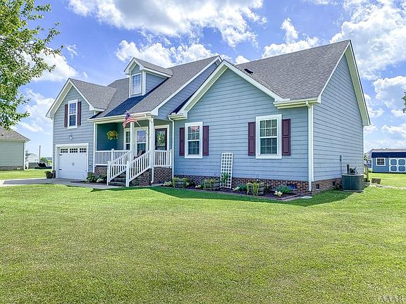 This beautiful home is located in a quiet cul-de-sac of Indian Ridge Estates, just minutes from the Va line & approx. 2 miles from the Shawboro Elementary Sch. Indian Ridge Estates is a small country subdivision with street lights & a common area. The home features an open floor plan & a large sunroom off the dining area. Catch the spectacular sunsets from the comfort of the sunroom or off the large back deck & patio. The home has a spacious primary bedroom & wonderful primary bath with a large soaking tub. Dedicated laundry is just off the entrance of the garage & has a large FROG.