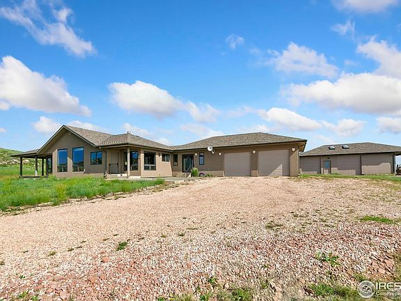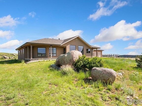 Surrounded by breathtaking 360 degree views and natures beauty, this well constructed ranch style home provides a foothills oasis with an easy daily commute to Fort Collins. Located a short distance from 287, just past the Owl Canyon turnout, this 40 acres features a varied landscape with open pasture for livestock, two small canyons with active springs, and rock outcroppings. Watch the sun and moon rise over the foothill vistas and enjoy daily visits by local wildlife including deer, bald eagles & turkeys. Very close to the future Glade Reservoir with future recreational opportunities including boating & hiking. The custom home features an open kitchen, dining and living space with picturesque views for miles including city light view of the Fort Collins valley. The main floor office is tucked away from the main living spaces, ideal work from home situation. The primary suite also features incredible views from the beautiful diagonal window, a 3/4 bath, and walk-in closet. The finished partial basement with 9' ceilings includes a large rec room with wet bar & mini fridge, the 4th bedroom, a 3/4 bath, and lots of storage space. Main floor laundry. Enjoy the sanctuary of the enclosed courtyard with two pergolas ideal for relaxation or entertaining. Energy efficiency was a top priority with 2x6 construction, southern exposure, quality wood windows, fully insulated garage, wood burning fireplace, and custom window quilts on all windows insulating from summer sun and winter cold. Built for fire safety with Stucco exterior & fire resistant deck. Equipped with a whole house generator. Livestock ready with a 1120 sq ft barn, outdoor runs, & fully fenced pasture. Garden area is fenced to keep out the abundant wildlife & features three covered raised garden beds. Active radon mitigation installed. Everything is in superb condition.