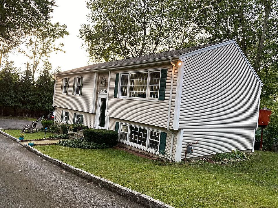 Perfect for a family, this is pristine raised ranch in convenient Belltown/Newfield neighborhood. This lovely, well maintained home features spacious living room, dining room, eat-in kitchen with vaulted ceiling and skylight leading to deck. Master bedroom has full bath plus 2 other bedrooms. All bedrooms & living room (upper level) have hardwood floors. Lower level has spacious family room with vinyl flooring and a laundry room with cabinets/storage. 2 car garage plus plenty of parking, central air. Huge patio for kids to play or summertime activities. Huge pull-down attic with plenty of storage area. More storage available under the staircase too. Big backyard, lots of space for the kids to play. Isolated from main road, hence gives a lot of privacy for the family. Walkable distance to Newfield Green shopping center which has Grade A market, CVS pharmacy, gas station, chase bank and many more. Walkable distance to the city bus stop. Driveway is common and shared with the front house. Front house has an easement to get to their property. Both houses shared maintenance of driveway. • New heating system furnace has been installed last year. Well maintained HVAC system. • Brand new garage door opener (in one of the doors) has been installed a few days back. • Brand new solid hardwood floor has been installed in living room few months back. • New vinyl flooring has been installed in the lower-level family room around a year back. • Brand new carpet installed on the staircase.