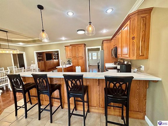 LUXURY LIVING! Don't miss this stunning ranch in a desirable subdivision. Gorgeous home has an amazing floor plan. This beautiful traditional home is located in the HEART OF KENTUCKY! It has gorgeous curb appeal and a landscaped yard. Experience unparalleled luxury in this stunning warming home! This luxurious home features 3 spacious bedrooms, 3 baths, 3 car garage & impeccable craftsmanship throughout. From the perfect front porch to entering front door, you will be in AWH! The vaulted ceilings in den and the classic built in bookshelves are so eye catching! DREAM KITCHEN! Awesome flow from den to open kitchen and dining areas. Wow factor-Wait until you see the new Calacatta Versilia Quartz countertops! BIG PLUS--New LG kitchen appliances! New Stainless steel sink. Very spacious island adds for so much space for entertaining. Kitchen also offers two dining areas with a more formal setting with new lighting and a breakfast nook dining area. Breakfast nook leads to a private patio out back. Light pours through abundant windows into this impressive, all brick home. The sumptuous master suite offers a spa-like bathroom with a Mansfield soaking tub, tiled walk-in shower, and luxurious finishes. Master suite has over the top trey ceiling with crown molding! The master also has a dream walk in closet. Beautiful setting set on .80 acre cul de sac just minutes from Downtown Campbellsville. Outside, indulge in serene living. This distinguished residence offers an unparalleled lifestyle. Complete with a large yard for entertaining! Garage storage galore! LOCATION LOCATION! You are minutes away from downtown. This impeccable home is ready for you! Expansive sunset views abound from multiple vantage points. Data believed correct but not guaranteed. Buyer to verify data prior to offer