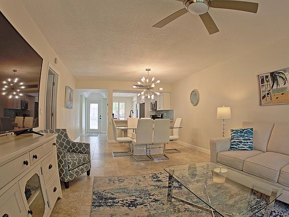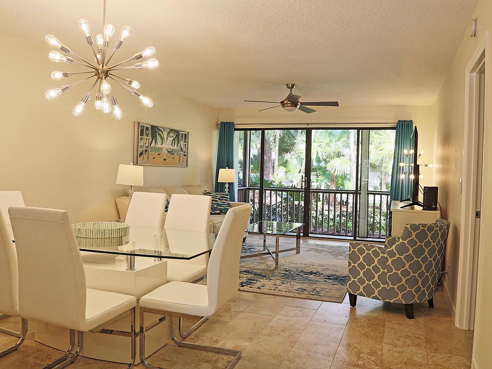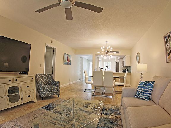 PGA Golf Villa 1st floor unit completely renovated! New tile throughout, new kitchen including cabinets, appliances and quartz countertop with overhang. 2 full size baths upgraded with new cabinets and quartz counters, custom tile, semi frameless glass doors. New lighting, switches and outlets, recessed lighting in kitchen, ceiling fans in bedrooms. Large master and storage closets. Lanai is screened with garden view with matching tile. New Front door is impact glass. Parking open in front area, close to pool, mailbox. Fully furnished with king bed in master, queen in guest and pull out in living area to maximize for living or rental capacity for investor.
