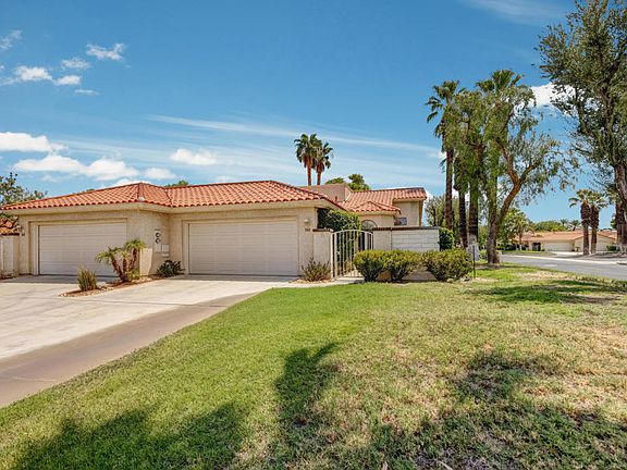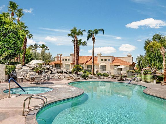 Lovely, Sought after & Rare Single-Story property in the desirable section, The Courtyards of Desert Falls CC. Two bedrooms, two full baths, located on opposite ends of property, w/Vaulted ceilings & lots of windows making this condo naturally bright! Sharing only one wall. Sweet Cul-de-sac location- Greeted by a nicely tiled courtyard entry, great for privacy. Cheery breakfast nook w/ single French door leading out to courtyard. Great sized kitchen, granite counters, & plenty of cabinets. Large living, family room with gas fireplace & large dining room. Primary bedroom is a great size, w/two closets & super large bathroom w/sky light! Although dated, it has one of the nicest interior locations within Desert Falls, shares only one wall. Close to two community Pools & Spas, w/one steps away from the Courtyards signature pool w/ waterfall, little bridge. Good size! Walking distance to everything Desert Falls has to offer! Pristine Health & Fitness Ctr., fantastic Tennis courts, and famous pickle ball courts - all included in your monthly dues as is all the exterior & roof maintenance, landscaping, Wi-Fi-Internet, cable. There's 24 hr. security at the gate. The Clubhouse & 18 hole golf course semiprivate allowing golfing & dining on a pay as you play or dine basis. There are memberships available. Only one owner - not remodeled, rarely ever come on the market, makes this property one terrific buy! Great neighborhood too! Sold as is. Call for your private tour:)