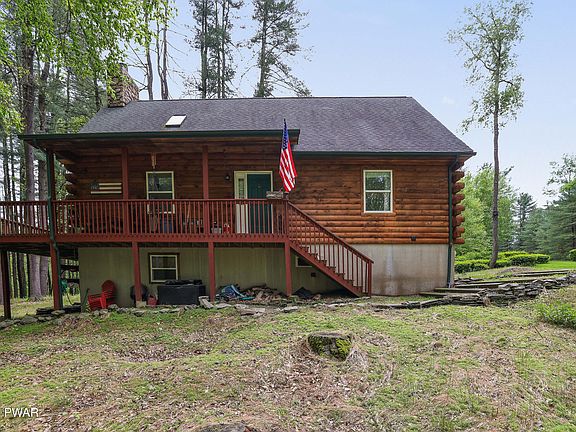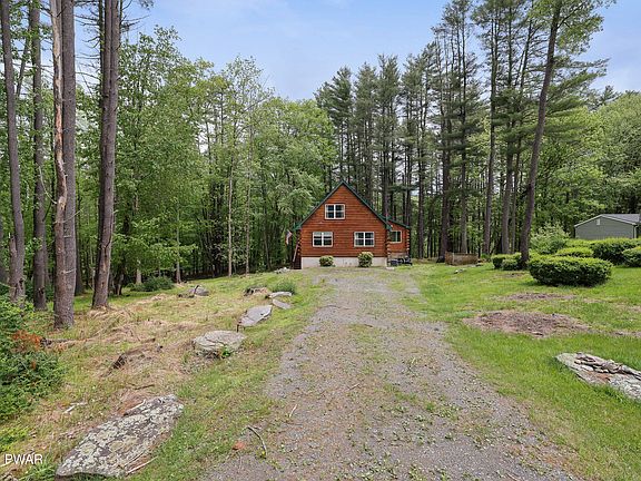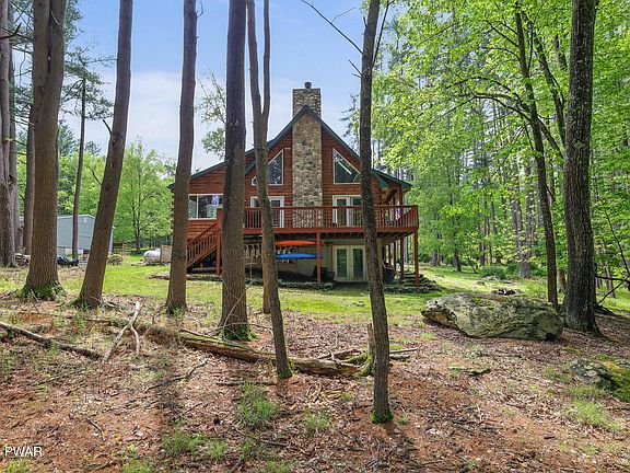 Masthope Mountain Community, Log sided Chalet for sale! This wonderful Chalet style home was built bordering forever green lands, and positioned on the land so that the large Chalet glass windows overlook this private wooded 1.3 acre lot. The home features an open floor plan with vaulted ceilings, 4 bedrooms, 3 bathrooms, primary bedroom with primary bath, 2 fireplaces, hardwood floors, huge walkout basement with family/game room, central air and heating, Florida room, and its all on over 1 acre of land. Most of the furniture is being included to get you and your whole gang off to a great start and in for summer. Masthope amenities are best in the region with wonderful skiing at Ski Big Bear, ski lodge, tiki bar, Summit Restaurant, 2 heated pools, playgrounds, dog park, equestrian center, Delaware river access, gaming courts, fitness center, motorboating lake with beautiful white sand beach and beachside restaurant, and more.