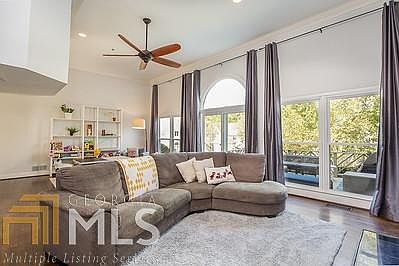 Bright, cheery and dramatic townhome in superb Vinings location inside I285! 2 car attached garage, private entrance, soaring ceilings and walls of windows (windows being replaced December!) open concept, 2 master suites! Separate dining room, eat-in kitchen with new SS appliances, bay window. Great room with fireplace and large enough for 2 seating areas, home office, playroom etc. Large deck overlooks pool and grassy yard. Pool services only 22 units so its like having a private pool! Great location for pets and children with easy access to outside. Grill on your deck all steps from your kitchen and entertaining areas. Just move in! Across the street from the Trolly Line Park. List of upgrades in docs. HOA takes care of most everything-water/sewer/trash/mosquito and pest control/sprinklers, exterior common areas, pool, stucco, driveways, streets and more!