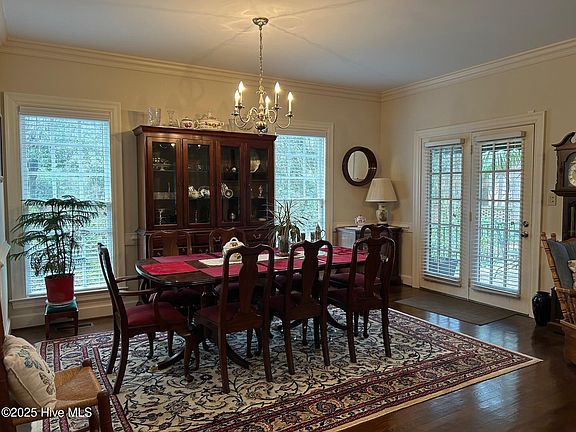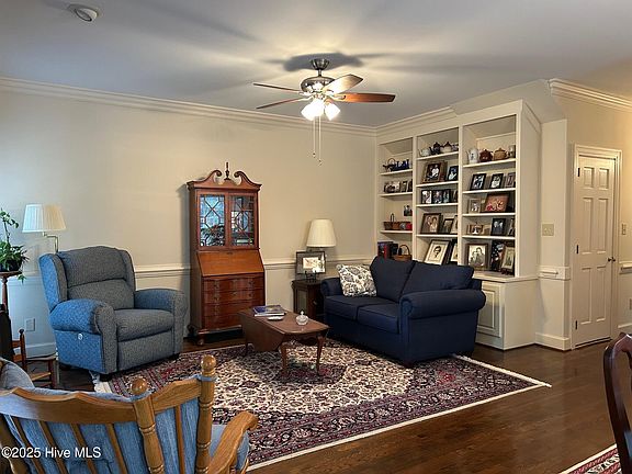 has bookcases and a fireplace. Large master bedroom down with lots of closets and a large bath. Second bedroom is down and has an attached full bath. The other two bedrooms are upstairs with another full bath. There are lots of closet space upstairs and some walk in storage in the attic. A large raised terrace in located off the great room and dining room with outside storage. This is a end unit and has lots of outdoor space and landscaping.