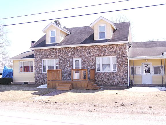 Charming Stone Cape. Open floor plan,many updates, newer appliances, stone fireplace. Front porch, back deck w/ hot tub. Large fenced yard, 2 stall attached garage