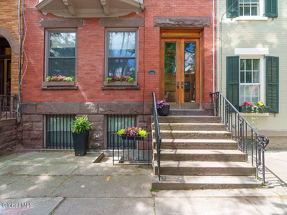 Built in 1894 by Gilded Age Albany entrepreneur Edmund Huyck, this rare & exquisite 3-story townhome which includes a separate garden residence, is situated among one of downtowns most aesthetically pleasing neighborhoods, Center Square. Just steps to State & Legislative buildings, Washington Park, Albany Medical Center, popular eateries, galleries, nightlife & much more. Desirable features include marble foyer, original woodwork throughout, built-ins, gourmet kitchen, walk-in closets, oversized windows, high ceilings, custom cabinetry, wood floors, granite surfaces, central AC, wood burning fireplaces, SS appliances, jetted/steam shower & antique hardware. Oasis like courtyard make for the perfect place to entertain close family & friends. Recent updates include bay window & wiring.