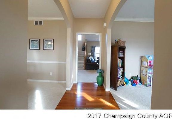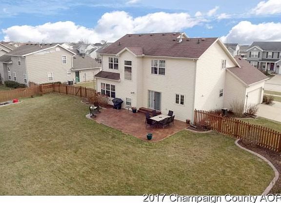 Wonderful Signature Built Wellington Plan in Prairie Fields Sub on corner lot with side load garage. This plan offers hardwood entry, 9 ft ceilings and 4 bedrooms on a basement foundation. Formal living and dining rooms, family room with gas fireplace. Kitchen is complete with stainless appliances, center island and walk in pantry. Sliding doors from the breakfast nook open to the stamped concrete patio in the large fenced back yard, which includes garden shed. The rear staircase is flooded with natural light that leads upstairs to the 4 bedrooms. Large master suite with cathedral ceilings, shower, whirlpool tub, dual sinks and walk in closet. Near Carrie Busey Elementary School and parks. Full basement for storage and future expansion. Living room can be used as office or play area.