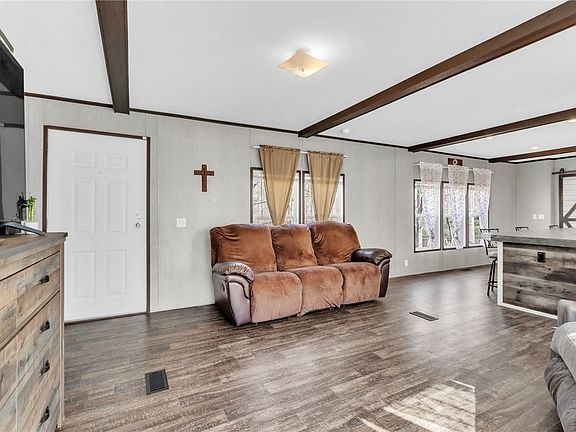 Tucked away on over 2.5 acres, this 3-bedroom, 2-bathroom home offers a warm, open-concept layout with farmhouse charm. The bright and airy kitchen is the heart of the home, featuring a spacious island perfect for dining in or gathering with loved ones. Ample natural light fills this home. The primary suite features new flooring and a large soaking tub, perfect for relaxing. On the opposite side of the home, two additional bedrooms provide a cozy space, ideal for family or a home office. Enjoy a freshly stained front deck and plenty of yard to roam. A privacy fence in the front adds seclusion, and the outdoor shed provides extra storage. This home feels like new!