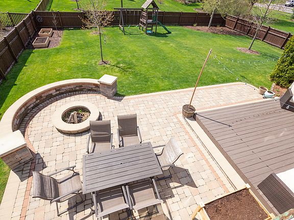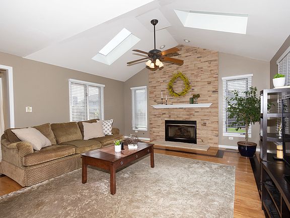 This almost 3,000 sf Deerpath Creek gem is right around the corner from one of the neighborhood parks and is on a cul de sac that bumps up to the nature preserve with a beautiful walking path. Inside this brick front home, you will be greeted with on trend white trim, new white quartz counters & a coordinating, updated back splash, stainless appliances, a new deep stainless sink & faucet. The beautiful, updated lighting highlights this fantastic kitchen where entertaining easy! The A/C & water heater are new, the hardwoods are upgraded with a dark trim accent and the focal point in the vaulted family room is the beautiful fireplace with a custom, floor to ceiling stone surround. There are skylights in the family room and the upstairs bathroom allowing for so much natural light. The first floor has a private office, 1st floor laundry room and spectacular powder room with bowl sink. Upstairs you will find 4 large bedrooms with the master boasting a walk in closet and its own private bathroom with double sinks, a jetted tub & separate shower. The carpet throughout the home is newer, the paint is fresh, 3/4 bedrooms have ceiling fans/lights and the front bedroom has new plank, vinyl flooring and a knock out custom window treatment. The basement is finished and has a separate room for storage with built in shelving and a large workbench. Wait until you see outdoor oasis in the private, fenced backyard! The owners updated & expanded the patio area to include an additional gathering space with a sitting wall and a built in fire pit. This beautifully designed, custom, outdoor area provides privacy and plenty of room for everyone! The three car garage has so many cabinets, automatic openers on both garage doors, an access door to the backyard and a nice full driveway. This house is a complete package and will not disappoint!
