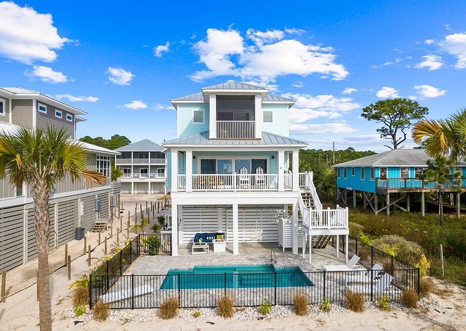 This is a beautifully appointed custom beachfront home located in a private gated community along Florida's sought-after Forgotten Coast. This is an incredible location with approximately 60' of beach frontage in an area that is FEMA flood insurance eligible. This spacious 2,197 sq. ft. residence offers an open-concept design that seamlessly connects the living room, dining area, and kitchen—perfect for entertaining and coastal living. The well-equipped kitchen features stainless steel appliances, ample counter space, and bar seating for four, with additional dining for six. Enjoy stunning beachfront views from multiple decks, complete with seating to take in the sights and sounds of the Gulf. Outdoor amenities include a private fenced pool (12' x 20'), an outdoor shower, and a gas grill—ideal for relaxing after a day at the beach. A direct private path provides easy beach access just steps away. The thoughtfully designed layout includes a first-floor king bedroom with private access to a full bath, while the second floor features a luxurious beachfront king master suite with an ensuite bath offering a separate tub and shower, dual closets, and a private screened porch. A queen bedroom and adjoining bunkroom share a Jack-and-Jill bath, providing flexible accommodations for family or guests. A laundry room is also located on the second floor. Perfectly situated between the peaceful waters of Indian Pass and the natural beauty of South Cape San Blas, this home offers access to pet-friendly beaches and the relaxed charm of the Forgotten Coast—an ideal retreat for coastal living or investment potential. Home is less than 4 years old and is sold fully furnished and equipped. Check out the virtual tour!