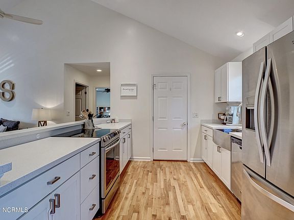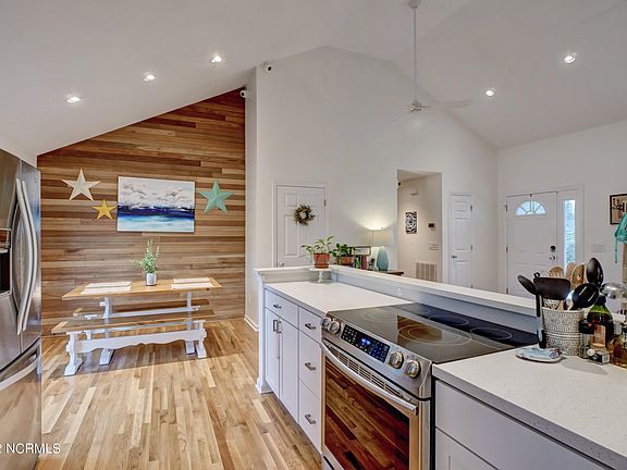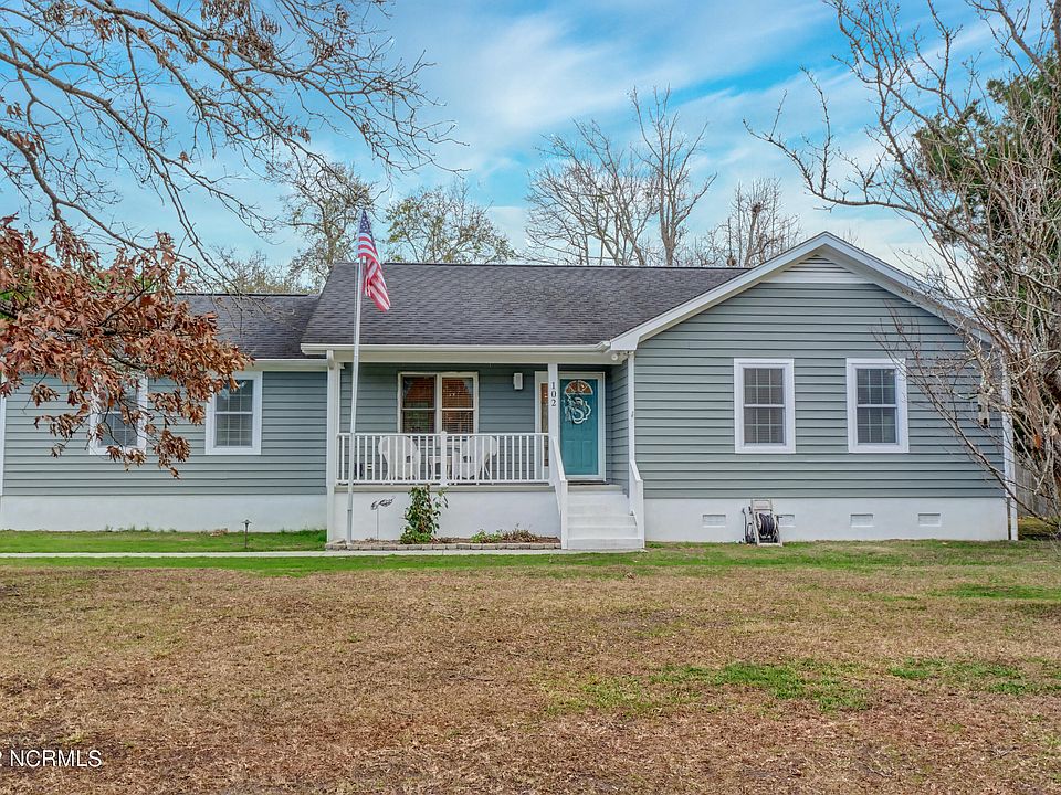 Welcome to this Charming 3 Bedroom 2 Bathroom home situated on a little under a half acre in the Hideaway Shores subdivision. This well maintained home offers an open floor plan with vaulted ceilings and lots of natural light. Updates include new cabinetry, countertops, appliances, upgraded Lighting with fresh paint on the interior and exterior. Great outdoor cooking awaits you under your large covered deck. You will have access to a community dock where you can dock the boat or watch the stunning sunrises over Topsail Island. This beauty will not last long!