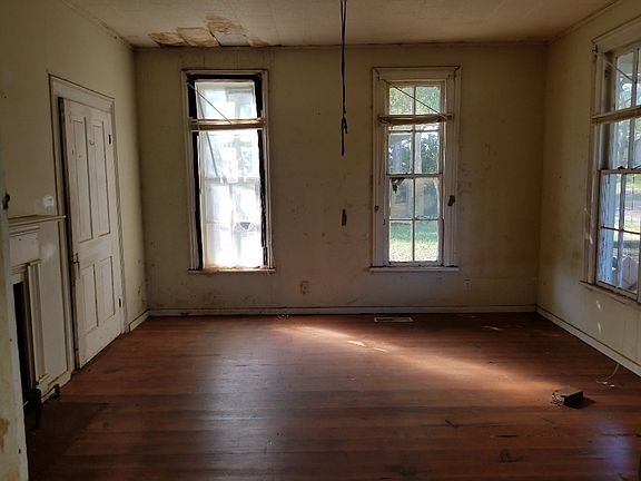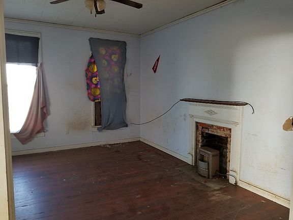 Lots of character & charm but needs a rehab to bring it back to life!! High ceilings in bdrm's and lvrm, wood flooring in main wide foyer and some other rooms, dining off kitchen w/wood-beamed ceiling. There are fireplaces in bdrm's & lvrm but are non-functioning and there are gas heaters located in front of each fireplace (unsure if this is heat source for home)