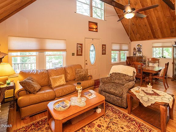 Cozy Chalet home recently renovated and in move condition marks the end of your search. Spacious living room with fireplace and catherdral ceilings. Modern kitchen with dining area and separate breakfast nook on enclosed porch with plenty of windows to take in the nature and let in the light. Full bath and one bedroom complete the layout of the first floor. There is an upper level loft/bedroom with access to a private upper level deck. The multi level decking continues with a lower level area that wraps around the side of the home offering plenty of space for grilling, sun bathing or outdoor entertaining. There is also two large sheds for additional storage or workspace area. The paved driveway wraps around the home and allows for plenty of parking. There are recently installed split units for efficient heating and cooling options. This home offers so much that must be seen to be appreciated. Cal today for your private tour.