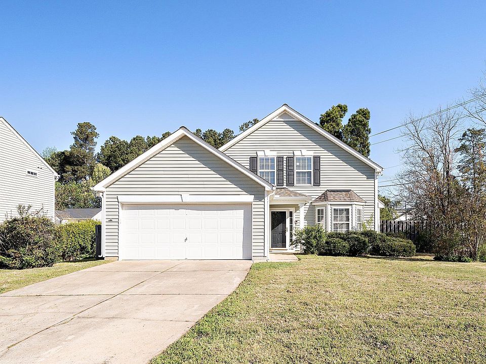 Great location in Downing Glen subdivision in central Morrisville. This home features a first floor primary suite/full bath and three upstairs bedrooms, 4 bedroom/2.5 bath total. Spacious living room w/ fireplace and bay window overlooking the front yard. Kitchen with maple cabinets, electric range, refrigerator included, sliding door to rear yard/patio. Laminate floors in living areas/primary bedroom, tile in bathroom, carpet upstairs. two car garage for storage and space for driveway parking. Roomy corner lot with a wooden fenced in yard. Community pool and playground. Centered in the heart of Morrisville, this home offers so much with location & value. 6 miles to RDU airport, 6 miles to RTP, 4 miles to proposed Apple campus on Little Dr. Showings start Thursday 4/11.