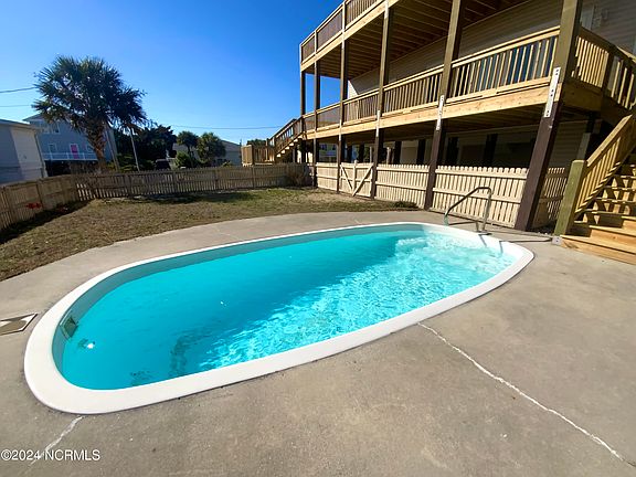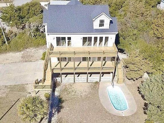 Enjoy the wonderful ocean breeze and breath taking views from this large beach home with 3 bedrooms PLUS large bonus room! This home has recently been remodeled and ready for you to make new beach memories! New features include new paint and flooring, new roof (2023), newer HVAC (2019), light fixtures, new kitchen with new cabinets as well as granite countertops and bathrooms. Also new solid large decks for entertaining made of #1 premium kiln dried lumber and stainless steel bolts and straps! Open the sliding glass door off the Master bedroom and enjoy a cup of coffee in the morning with the ocean waves crashing in the background or relax with a glass of wine in the evening. The Master Suite also has 2 MASTER BATHROOMS both with walk in tiled showers (one for him and one for her) and a large soaking tub. The large reverse open floor plan and floor to ceiling windows bring in tons of beautiful natural lighting in the kitchen, dining and living space. Other details include, double pane windows, built in shelving, a wet bar, stainless steel appliances, washer/dryer and utility sink, recess lighting, ceiling fans, and an elevator! The high private lot is NOT in a flood zone (No flood insurance required) ,is partially fenced in for your pets and also has a private inground pool..... perfect for cooling off. After having fun at the beach all day you can rinse off in the large outdoor shower and there is plenty of outdoor storage for all your beach toys!, There is an abundance of covered parking and driveway space for all your guests. Such a PRIME location with a tiny walk to the beach access from you driveway and close to all Emerald Isle has to offer such as dining, shopping, movie theater, golf, water park, putt putt, bowling, arcade, pier, watersports, nightlife and more!