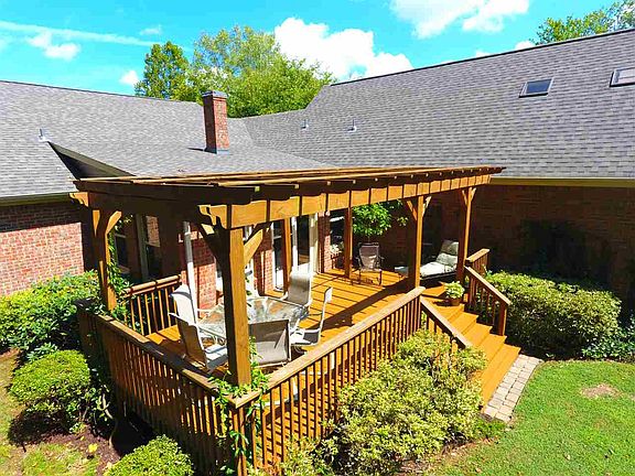 Large front porch and spacious deck with pergola to make the most of outdoor living.Hardwood floors in foyer.Recently renovated, kitchen features custom cabinetry, stainless appliances, counter height snack bar, tile flooring, plus pantry and coat closet.Laundry room also includes custom cabinets.Large breakfast room. Dining room might be repurposed for a study or other use.Wood stove warms vaulted family room.Master suite includes two closets and private bath.Custom designed built-ins add functionality to sunroom.Oversized two-car garage.Spiral staircase leads to bonus space - open room with skylights and ceiling fan, 2 walk-in storage areas and additional stubbed in 1/2 bath.