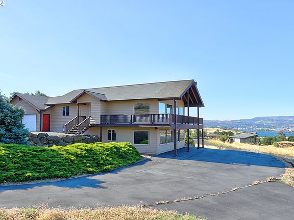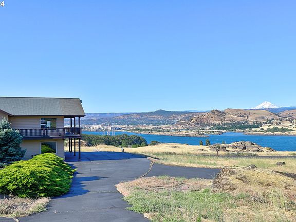 Nestled on a bluff overlooking the Columbia River and facing Mount Hood, this home is a marvel of contemporary design with a nostalgic touch. Inside, the house opens up to a grand living space that seems to float above the landscape. The wall of windows provide an uninterrupted view of Mt. Hood, standing tall and serene in the distance. The kitchen, though modern in its amenities, has a nostalgic touch with an extra wide vintage range, vintage look green cabinets and expansive marble look countertops with two sinks provide ample space for cooking and entertaining.The huge walk in pantry has a place for everything you need. The back door deck leads to the garage and a private patio tucked away from it all; is a great space to grill on a windy day. The side door from the dining area takes us to a covered deck that extends around the view side of the home.The primary suite is on the main level. This bedroom window faces the Columbia River looking west, perfect for the sunset view. The en-suite bathroom features a soak tub, corner shower and a double sink vanity. Also find a spacious and organized walk-in closet. On the lower level you will find two additional bedrooms, an office, full bathroom with a laundry area and a bonus storage room. Both lower level bedrooms have large windows to absorb the views and soak in the natural light. The larger of the two bedrooms doubles as a den with a relaxed seating area. A Murphy bed might be a great option here to double the use of this room. The sliding door from this bedroom to a patio allows for additional outdoor enjoyment.For exterior storage look to the finished double garage and the recently updated heated and insulated well house.The acre of land is low maintenance and naturally landscaped to minimize water usage and upkeep.