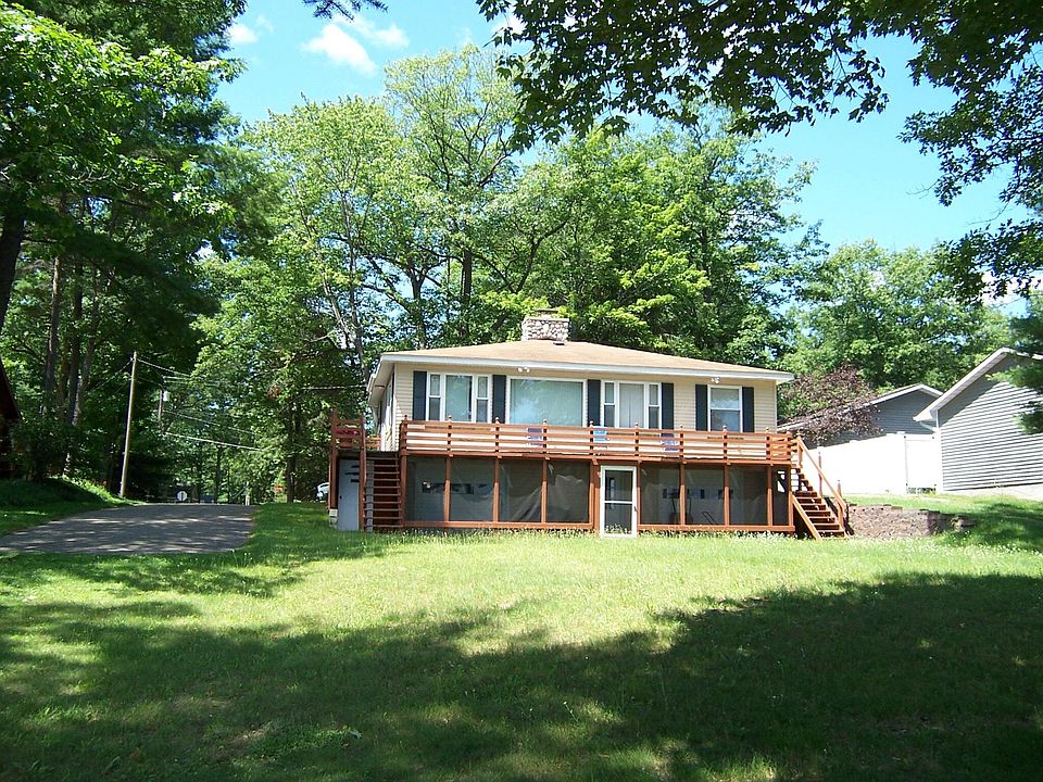 HIGGINS LAKEFRONT with hilltop setting providing a full walk-out basement, and spectacular views from this NW section of lake. This spacious classic cottage in a park-like setting, provides space for future addition to home or garage construction. Frontage is beautiful sand. A nice quiet walkable neighborhood. Nearly 180 degree lake views from the large windows. Main level features 3 bedrooms, one bath, stone fireplace, open floor plan, and a wrap-around deck. Basement features a newer bedroom (non-conforming), shower/dressing room and a space for future a family room with 8 ft. ceilings! Basement has 2 overhead doors that open to a large screened patio! Updates include windows, drain field, well pump, and electrical panel.