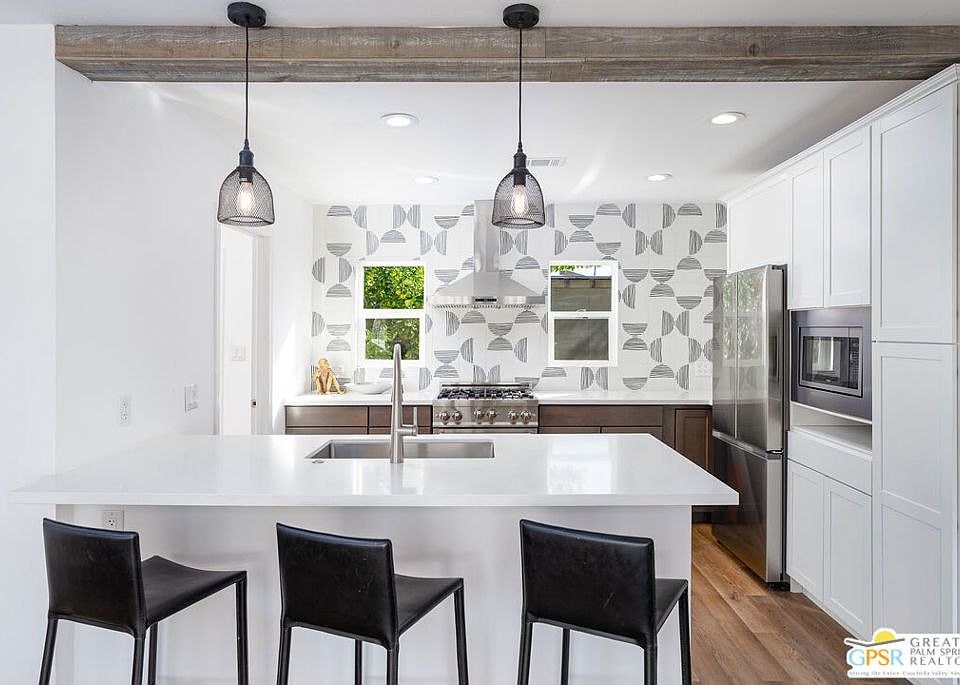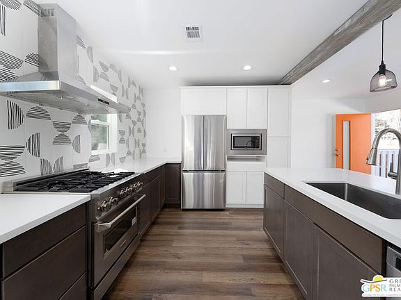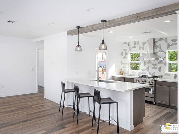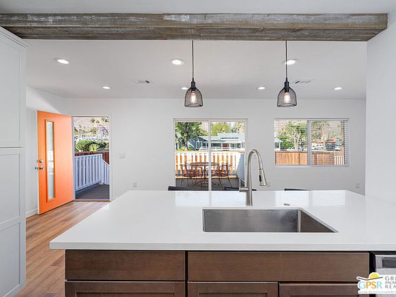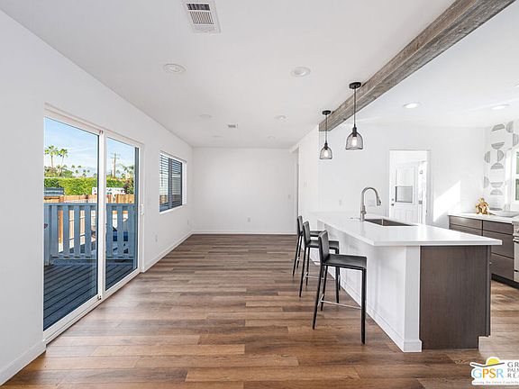 Fantastic opportunity to own a unique prefab manufactured/mobile home in the heart of Palm Springs. Complete permitted remodel in 2024/2025, the home includes two bedrooms and two bathrooms each located on separate ends of the home providing a smart separation of space for your and your guests, or even a home office. The open-concept kitchen is centered in the home, and open to the living room, dining area and looks directly out across the deck to the western mountains. Updated to reflect a true Palm Springs style and modern living, included are stainless steel appliances with a built-in microwave and refrigerator, full gas cooktop range, ventilation hood, spacious two-tone cabinetry, beautiful tiled backsplash and large quartz countertops. The primary bedroom includes a private ensuite bath, tall ceilings and a spacious walk-in closet. The guest room also has a private ensuite bath, spacious built-in closets and tall ceilings. This home has one of the largest private yards in the entire community, and is accessible without having to enter the community. This private yard enjoys a huge ~10ft x 16ft front deck and additional space enough for your own private spa/spool, and seating areas surrounded by a tall fence and mountain views. The entire home has been upgraded with added insulation in the walls and attic. Additional upgrades include: recessed lighting, ceilings fans, hardie board cement lap siding, energy efficient dual pane windows and sliders, luxury vinyl plank flooring and upgraded electrical service. The interior laundry room is enormous with upper cabinets, washer/dryer hook ups for a gas or electric dryer, and access to the back yard. The community clubhouse includes a pool and spa, large banquet facility, exercise/workout equipment, Shuffleboard courts & library. Centrally located in Palm Springs, the community is an active 55+ community close to shopping, groceries, coffee and restaurants. The monthly fees include water & trash.