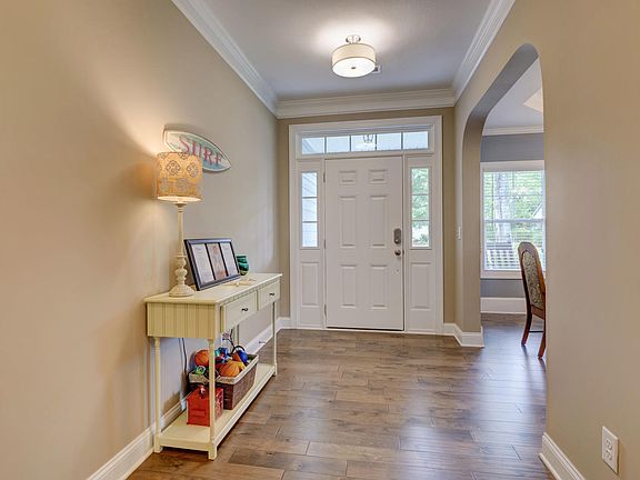 Located on the 16th hole of the Olde Point Golf Course in the subdivision Golf Terrace Village, this meticulously-maintained 4 bedroom, 2.5 bath custom home boasts front and rear porches, pleasant pond views, and new interior paint throughout. Built in 2016, it features an open floor plan with a large living room, formal dining room, eat-in kitchen with over/under cabinet lighting, 1st-floor master suite, and soft-close kitchen and bathroom cabinet doors and drawers with matching granite counters. Throughout the 1st-floor common area is 2-piece crown molding (1-piece is located throughout the rest of the 1st floor) and real hardwood flooring. The 2nd floor has 3 bedrooms, a full bath, and an open media room. The home is wired for an upgraded low-voltage surveillance system up to 6 cameras. The home is energy efficient with low-E glass windows, a 17 SEER HVAC unit, and an energy-efficient electric water heater. The exterior has fiber cement siding, which is resilient to hurricane force winds and salty sea air, and the attached 3-car garage has an epoxy floor and storage located above. This is a must-see home! Olde Point is in the award-winning Topsail school district and is minutes away from the Topsail Island beaches and the Porters Neck area of Wilmington. Residents can purchase a membership to the Olde Point Country Club amenities, including golf course, tennis courts and swimming pool. The club also has a restaurant that’s open to the public. Please note: the neighborhood streets are due to be repaved this summer per the seller.