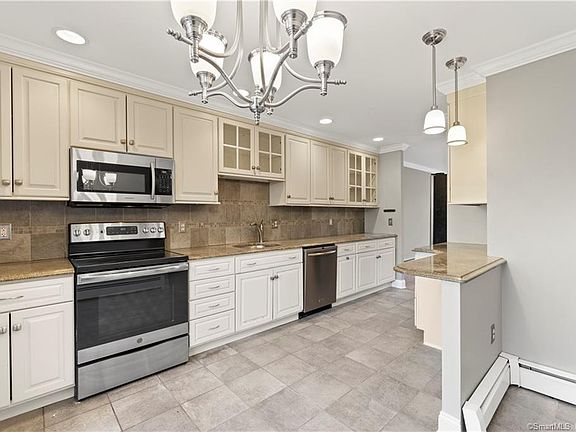 This well-maintained condo offers privacy and low maintenance living. Bright and open living space is highlighted by an updated kitchen featuring granite counter tops and a tile back splash. Step out onto the deck and enjoy serene views of wooded property. Upstairs you will find a master bedroom and full bath, as well as a second bedroom and additional full bath. The finished basement is large enough to fit a gym, private office or to provide extra living space. Conveniently located near the historic town green, shopping, highway, and train station. HOA fee includes heat and hot water. Being sold as is. Schedule a showing today!