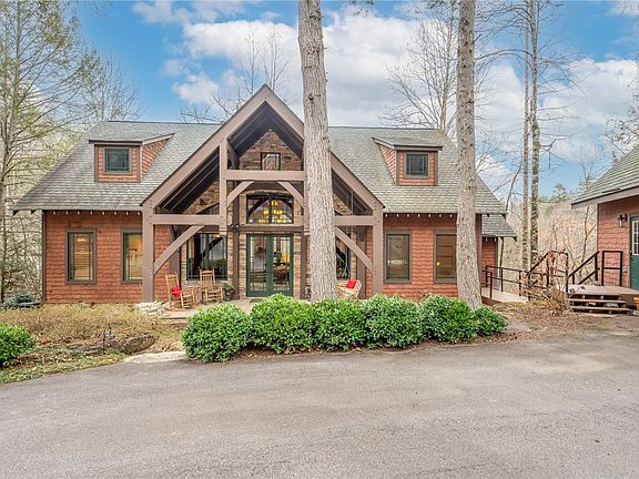 Past a private gated entrance and ambling drive, the home presents a stone and cedar shake facade. The interior opens to a large great room with massive timber gables and beams, stone fireplace, and large expanses of glass overlooking the river. The open kitchen is equipped with GE Profile appliances and custom-made hickory cabinetry. The master suite includes a plank ceiling, and, in the bath, a pebble-floored double shower and clawfoot tub in a window-lined alcove. Main-level rooms open to a rear covered deck and adjoining side screened porch.