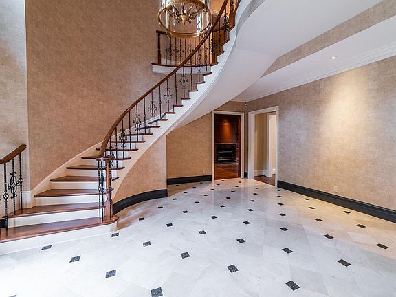 Baroque inspired architecture featuring large light filled rooms w/ dramatic finishes define this spectacular showplace. Grand foyer boasts a graceful hanging staircase setting the mood for the richness & beauty thruout. 2 BRs on the main include the lovely master suite & morning room overlooking pool & gardens. Handsome paneled library, stunning LR, spacious DR, commercial kitchen, & sunroom complete the main. Upstairs are 3 ensuite BRs & large den. Basement has gym, sauna, media, BR,& kitchen