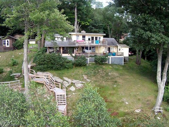 Classic Lakefront Lodge with Guest house, amazing lake views and 275' of frontage on Lake Wallenpaupack. Enjoy the Private grounds with 1.25 ac, mature trees, lg decking and screened porch overlooking lake for entertaining & relaxing. Lodge has 4 BR, 4 baths, HW floors & stone FP. Many new upgrades, such as Master suite with private deck & new roof. Guest house features 1 BR, 2 baths & covered deck overlooking lake. Possible rental income. Furniture included.