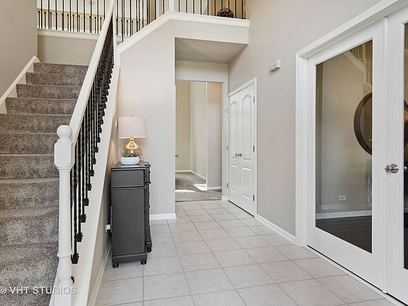 Welcome to this beautiful Brentwood Estate home, nestled at the end of a quiet cul-de-sac with a backyard that offers a panoramic view with mature trees, providing shade in the summer and beautiful fall foliage. Beyond the professional landscape, you will find a well maintained Park District lake. Your first step through the grand front entrance of this home brings you to a stunning and spacious two-story foyer where you're greeted by one of this home's greatest assets, an abundance of windows with the flow of natural light. You will love the dual staircase that boasts wrought iron balusters, bay windows in the dining and living room and the French doors. The 2-story spacious family room has an exquisite palladian window and a soaring double-sided fireplace which feeds into the heart of the home, your kitchen. With a 9 foot island and a large eating area, this updated kitchen is a homeowner's dream for family gatherings and entertainment and is equipped with stainless steel appliances, including a wine refrigerator, quartz countertops, extra-large walk in pantry, corner sink with dual windows, and generous cabinetry reaching the nine foot ceiling. Off the kitchen you step onto a lovely maintenance free Trex deck to enjoy the beautiful backyard scenery. Also on the main floor you have the convenience of a bedroom and full bathroom, to be used as an in-law suite or bonus room. The mud room sits off the 2.5 car garage with a built-in bench, cubbies and cabinets. Upstairs you will find a beautiful primary bedroom with a vaulted ceiling, en suite bath, separate shower room and a spacious walk-in closet. The second story catwalk leads you to bedroom 3 & 4 and a jack-to-bathroom. Another unique feature to this amazing home is the basement is soundproof to the upstairs! In the fully finished basement, you will discover a huge area to set up for family fun, a half bathroom, generous laundry room with stainless-steel front-loading washer and dryer, a huge closet to store toys and family games, a bonus room which could be used as a 5th bedroom or office, and a very large storage area with built in shelving. The main floor and upstairs have new carpet and fresh paint. This house has a fully equipped Home Assistant Smart Home system for security, control and alerting. THIS HOME HAS IT ALL, including a great location-you are a walk away from your elementary school, beautiful Waubonsie Lake, Oakhurst Forest Preserve, playground, soccer and baseball fields, basketball, tennis and pickleball courts, Fox Valley Park District, swimming pool and club house and the AWARD-WINNING SCHOOL DISTRICT 204. You are only a short drive from route 88, PACE bus, train station, and the best shopping and restaurants in the area! THIS HOUSE IS BETTER THAN NEW AND MOVE IN READY!