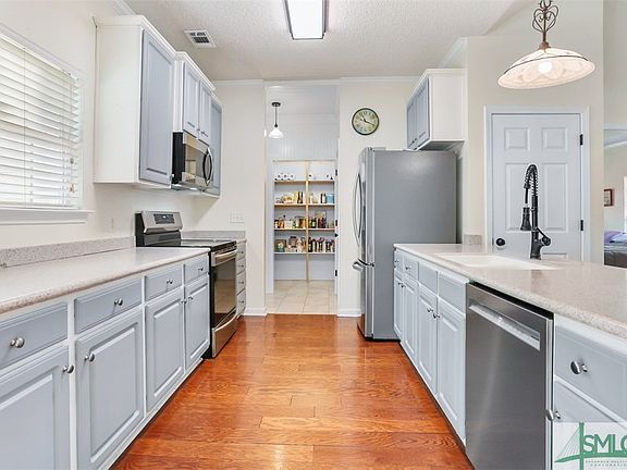 One of a kind back yard Oasis! Light bright open floor plan with vaulted ceilings in living room and crown molding throughout. 3 Bedrooms, split plan, 2 baths (owner en-suite has his and her sinks, Jacuzzi tub, separate shower and ceramic tile flooring. A very large bonus room could have many functions: Den, playroom, man-cave, family room and more. Fully equipped kitchen: Induction stove/oven, new refrigerator, dishwasher, microwave and pantry. The private back yard has an In-Ground salt water Pool with Hot Tub/Spa, lush landscaping and lighted palm tree. All secure by a privacy fence and wooded view beyond. There are 2- 10x20 exterior Handi House Storage buildings. 1 Building is sheetrock and has lighting/fan (perfect for workshop, gym, playroom). Large Car-Port secured by fence. This home is located a short drive to Hyundai Plant. Convenient to shopping, dining and medical facilities in Pooler and Savannah.