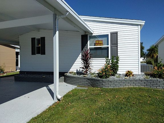 This charming home has a great location and is perched on Palm Lake... just a few doors down from the Resort style clubhouse in The Gardens and the Olympic size pool with a large sun deck! Unfurnished 2 bedroom, 2 bath, Open floor plan has a great view of the lake from all common areas! Gorgeous Tigerwood finishes wood laminate, some drywall, indoor laundry with new stackable washer and dryer, new 2.5 ton AC in 2019, Rheem water heater 2020, updated plumbing, also new floor in kitchen and bathroom, new vanities in both bathrooms, new closet, new paint through out the house ,new blinds on all windows, updated kitchen , gorgeous granite countertops, new dishwasher, the roof is only a few years old as well! This home will be available to the buyer plus this lovely home features a double carport! There is lots to do in this active 55 plus premier community, many planned activities, entertainment, dinners, resident outdoor kitchen, fire pit, clubs to join, craft room, state-of-the-art fitness center, billiards, pickle ball, tennis, and much more and you're so close to all the action! Lot rent includes access to all amenities, lawn mowing and trimming, Spectrum Internet and cable plus two HD boxes. One dog or one cat is allowed. Lot rent is $934 plus taxes. Close to shopping and dining and just a short drive to Florida's fantastic beaches! All listing information is deemed reliable but not guaranteed and should be independently verified through personal inspection by appropriate professionals.