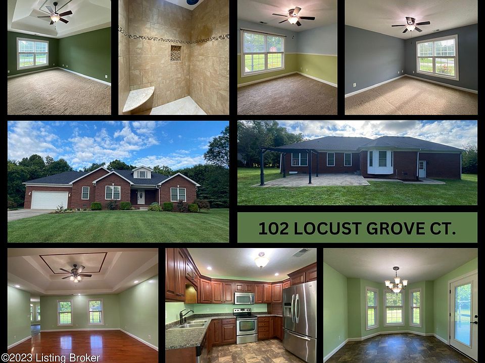 Lovely home in a well-established neighborhood awaits you at 102 Locust Grove Court. Spacious & comfortable three bedroom two bath brick ranch situated on nice large .89 acre lot. Lovely living room with hardwood floors & decorative tray ceiling. Bright & cheerful Eat in Kitchen with plenty of nice cabinetry & comes equipped with a full complement of stainless appliances. Large Pantry & separate Laundry Room. Home offers a desirable split floor plan that offers the utmost in privacy & plenty of storage with lots of closet space. Large carpeted Primary suite allows for oversized furnishings & Primary Bath offers a soaker tub & corner tiled walk in shower. Two additional carpeted bedrooms & full Hall Bath are housed on the opposite side of the home. Venture outdoors where you can kick back & relax on the great stamped patio. Plenty of room to roam in the large back yard with outbuilding that provides additional storage. Great commute location to Louisville via 31W as well as Louisville, Elizabethtown & Ft Knox via I65. Conveniently located near all the amenities of town. Don't miss this wonderful home.