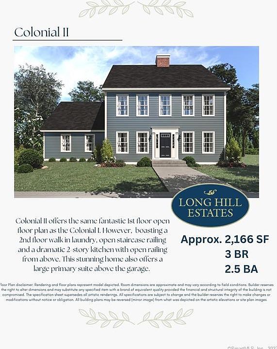 Long Hill Estates is an enclave of 8 home sites nestled within the picturesque rolling landscape of East Hampton's Historic Middle Haddam. The Colonial II - a dramatic mix of a classic Colonial design boasts a two story kitchen with balcony overlook with open railing. The first floor also offers an open floor plan with great room and kitchen located in the entire back of home and a large dining room. Side staircase with window and window seat to second floor is positioned to maximize the first floor space. The second floor includes an oversized primary bedroom suite with a large walkin closet and ensuite with walkin tile shower. Also, included in the upper level is an oversized walkin laundry room and loft area. Some possible options include front porch, 12x12 sunroom and so much more. Some additional standard features include granite counters, hardwood floors on first floor, gas fireplace, decks, white cabinetry. The list goes on Lot 5 requires paved driveway with turn around at an additional $7,000 cost to the buyer. All homes can be built on any home sites.