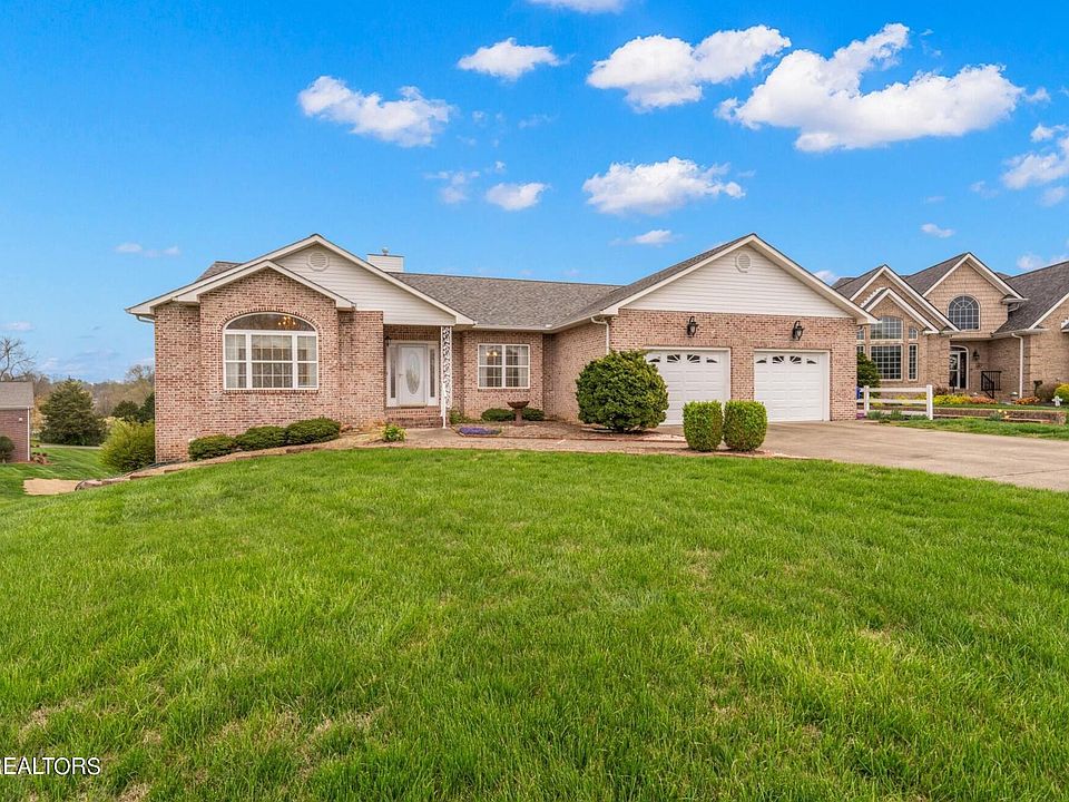 This 2,280 sq. ft. 3-bedroom, 2.5-bathroom brick ranch features an open floor plan and is nestled in a tranquil cul-de-sac within Mariner Point, one of Clinton's most sought-after neighborhoods. It boasts over half an acre of land with serene ridge views from a spacious 34x12 double entertainment deck. The entrance welcomes you with shining hardwood floors and elegant crown molding that continues throughout the house. To the left, a generous 17x16 formal living room bathed in natural light from a Palladian window is highlighted by a cathedral ceiling. The foyer leads to a 16x15 open-concept family room with a stately gas log fireplace and recessed lighting, which opens to a 20x15 gourmet eat-in kitchen adorned with red oak cabinets, Corian countertops, stainless steel appliances, and includes a 2020 refrigerator. The bay-windowed breakfast area offers casual dining, while the 14x12 dining room provides a more formal setting with crown molding, recessed lighting, and a striking chandelier. The main-level master suite features deck access, a vast 12x6 walk-in closet, and an 11x10 tiled master bath with a large dual vanity and a luxurious whirlpool tub. A split bedroom layout includes two sizable 13x12 guest bedrooms with plenty of closet space and a nearby 10x9 full bath with a solid surface vanity and a large walk-in shower. A convenient half bath with a pedestal sink and a 7x5 laundry room with storage cabinetry make chores easy, with a 2020 washer and dryer included. Storage is ample with a large 22x26 garage, a walk-in 200 sq.ft. basement storage room, and attic space. The home features a new roof from 2020, HVAC from 2011, a front bed and lawn irrigation system. It's just 5 minutes to downtown Clinton or Oak Ridge and 20 minutes to downtown Knoxville.