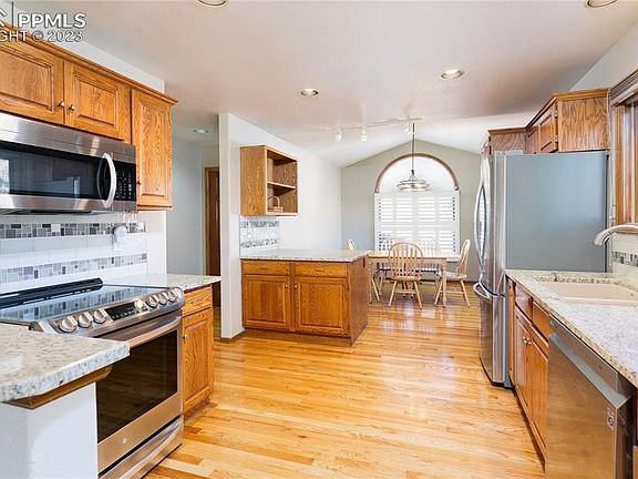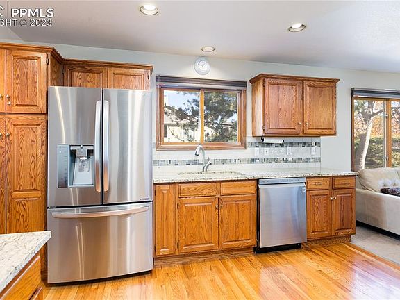 This private, end-unit townhome in the Sun Mesa community has a beautifully updated kitchen with granite counters, newer stainless appliances and plenty of space for the chef. The main level also has a powder bath, a large primary bedroom with vaulted ceiling and attached 5 piece bath with walk-in closet and built in cabinets. There is also another main level bedroom and living room with gas fireplace that both walk out to the covered and semi-enclosed rear deck to enjoy the views all year round. The lower level is easily accessed by a staircase with a landing and has two additional bedrooms, a full bathroom, a family room and plenty of storage. This is your chance to experience no maintenance living in a beautiful townhome community that is conveniently located just minutes from I-25 and the Northgate exit in the Gleneagle Neighborhood.
