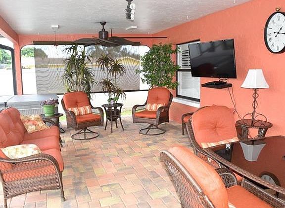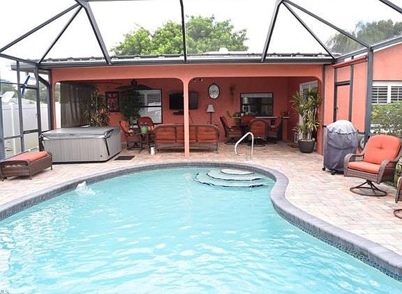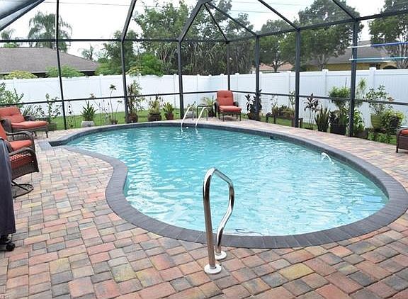 Corner lot pool home in Willoughby Acres. New metal roof in 2015. Large screened patio with solar heated pool and separate above ground spa. Paver lanai, driveway and parking area with plenty of room to for your r/v or boats. This home as many upgrades including trey ceiling in kitchen, tile backsplash, stainless streel appliances, plantation shutters throughout and custom "California closet" in master bedroom. Bathrooms have been renovated with granite countertops and custom tile work in shower and bath. Spacious corner lot with mature landscaping and numerous fruit trees. Back and side yards are completely fenced with white PVC privacy fence. Excellent location close to Immokalee Rd and I-75. Furnishings are negotiable.