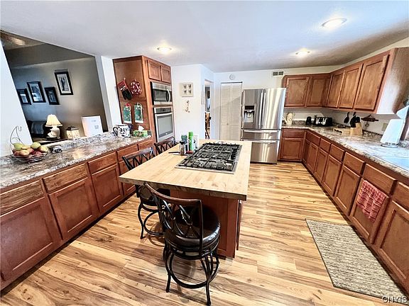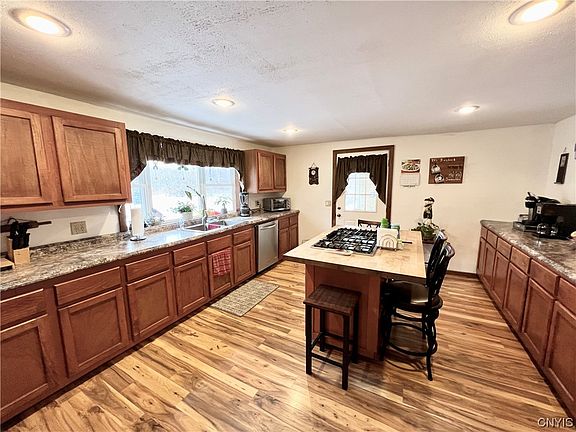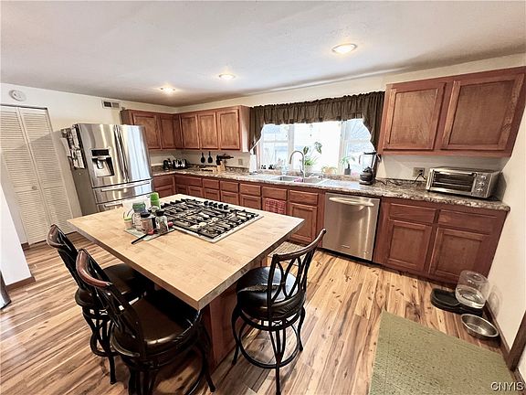 Be sure to check out this 3-bed, 2-bath house located in Scriba, NY. Sitting on 1.65 acres, this listing has two good sized bedrooms on the first floor, with a third bedroom on the private second floor that has also served as a family room and even a studio-style residence in the past. Built in 1989, this home has had many renovations and updates including new kitchen appliances and washer/dryer, new carpeting, new wood floors, new hot water tank, and added 100 amp electrical service to the barn/second garage. The living room is stunning with vaulted ceilings. The kitchen is newly updated and opens to the backyard that is fenced in and has a playset that will stay. The barn has two stories and is great for storage or extra gathering space.