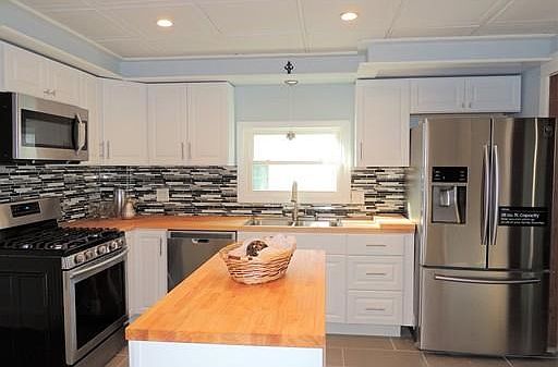 This house is a charmer! 3 Bedrooms,1.5 baths with tons of storage cabinets. Custom kitchen remodel with butcher block counter tops, tiled back splash, beautiful white cabinets and stainless steel appliance package. Lovely kitchen island and walk in pantry to die for! Kitchen opens to a large open dining room with sliders to deck. Both bathrooms have been renovated with beautiful tile and brand new white vanities. Refinished hardwood floors and freshly painted throughout. Large family room with brick fireplace and wonderful built in cabinets. New roof! New windows! New hot water tank! Exterior has been freshly painted and the large porch is ready for a homeowner to enjoy!