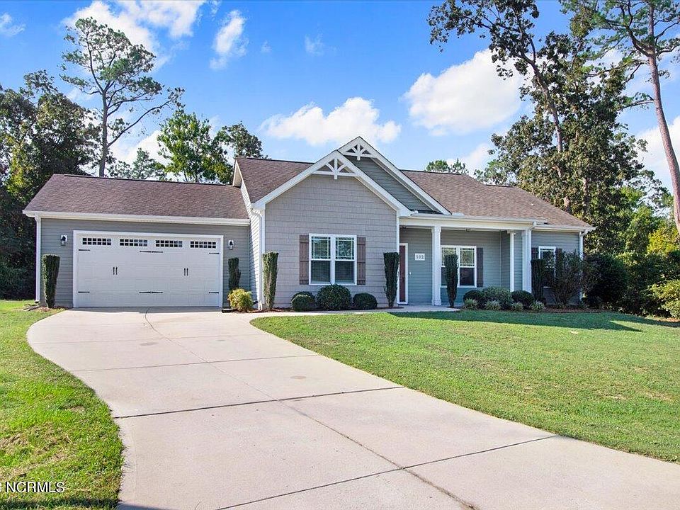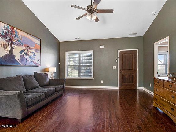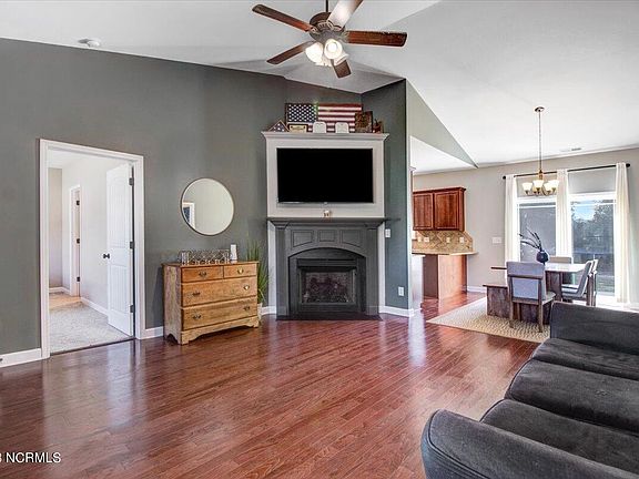 The home features an Open Floor Plan, Large Great Room with Gas Log Fireplace, Upgraded Hardwood Floors, & Vaulted Ceiling. There is a Spacious Kitchen with 2 seater bar and Large Dining Area, Granite Counters, Tile Backsplash, Pantry, & Stainless Appliances, Full Size Laundry-