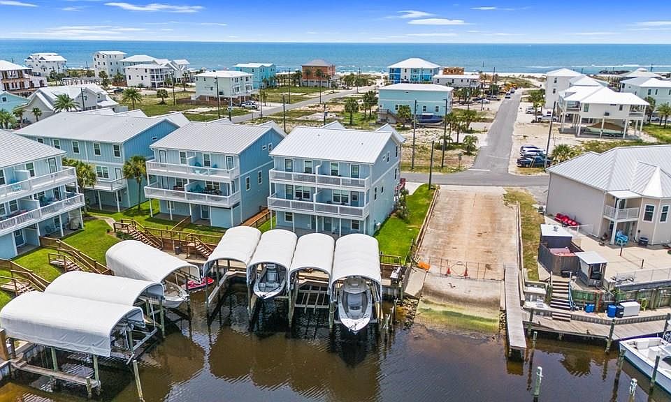 ATTENTION BOATERS AND FISHERMEN! CANAL FRONT, BEACHSIDE NEWLY BUILT TOWNHOME WITH COVERED BOAT SLIP! Don't miss this rare opportunity to own a canal-front property on the beachside of Hwy 98. This beautiful 3 BR/3.5 BA townhome with an additional bunk area is located a half block from the beach making it perfect for the fisherman and family! The townhome is beautifully furnished with high-end furniture, making it truly turnkey. Upon entry, you will notice the Coretec LVP that is throughout the main floor as well as the Wet bar featuring a beverage cooler and additional cabinet space. Making your way into the kitchen you will see the custom cabinets, granite countertops, and Bosch stainless steel appliances. The first floor features the garage, perfect for parking or storing fishing equipment and beach gear, and the first bedroom which is an ensuite with a tiled walk-in shower and access to a private porch overlooking the canal. The main floor features a kitchen with custom cabinets, granite countertops, and Bosch stainless steel appliances, a living room with a wet bar that holds a beverage fridge, a powder room, and the laundry room, which features a GE washer and dryer. The top floor features the master suite, with dual vanities, an oversized walk-in shower, and a private balcony perfect for watching the boats come by, an additional bedroom with its own bathroom and balcony with a GULF VIEW, and an additional bunk area, holding two twin-size built-in bunks. The amenities of the property include a personal covered boat slip with a 13,000 lb lift, great deck space, and a 13x15 garage. Being on the beach side eliminates the worry of having to go under the Hwy 98 bridge which is perfect for anyone with a tower. Don't miss this rare opportunity!