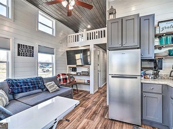 Tucked away in the gated Waterside at Blue Ridge community, this charming tiny home offers a peaceful mountain retreat with all the essentials for a relaxing getaway-or a smart turnkey investment opportunity. Step inside to a thoughtfully designed space featuring a main sleeping area, an additional bedroom/office, and a spacious loft, perfect for extra sleeping room, lounging, or storage. The cozy living area flows into a well-equipped kitchen that includes full-size appliances such as an electric range, microwave, and a refrigerator/freezer combo. A dedicated coffee bar, double sink, and plenty of cabinets make this space both stylish and functional. You won't find another tiny home with 1.5 baths in the community. Seller is offering the home + furnishings for $233,000 and at $227,000 unfurnished. Out back, you'll find one of the home's standout features: direct access to a trout creek right from your yard. Get your license and practice your fishing skills straight from your property. Whether you're fishing or simply enjoying the sound of the water, it's a serene touch you won't find every day. The deck and the fire pit area provide additional space for entertaining while soaking in the mountain air. As a guest, you'll enjoy access to all the community amenities Waterside has to offer, including a swimming pool, clubhouse with showers, laundry, and kitchen, playground for the littles, community fire pits, pizza ovens, and a dog park. There are also fishing ponds, disc golf, a Gaga Ball pit, and flat, paved roads ideal for bikes or golf carts. Just minutes from Lake Blue Ridge, scenic trails, waterfalls, orchards, wineries, and the vibrant downtown Blue Ridge scene, this location makes it easy to explore the best of North Georgia. Harrah's Casino in Murphy, NC is a short scenic drive away for those looking to add a little excitement to the itinerary. Whether you're planning your next peaceful mountain getaway or seeking a fully furnished, rental-ready property, this tiny home offers both charm and income potential in one of Georgia's most desirable vacation destinations. Summer Britt with Mtg-Pro is a lender who offers financing on this type of property.