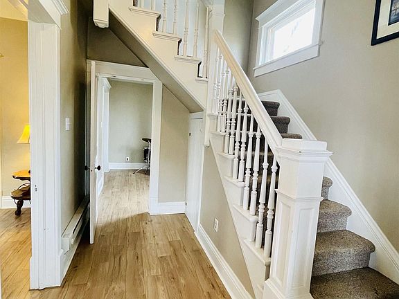 Charming 2 bed home boasting a beautiful staircase near the front entry along with an enclosed front porch. Newer flooring throughout the main floor, offering an open living room, formal dining space and bonus room, great for either an office or play room. Freshly painted cabinets in the kitchen featuring additional storage in the pantry with accessible open shelving and built-in cabinetry. Upstairs offers a full bathroom with 2 bedrooms and additional storage space. Nice sized backyard with large storage shed and alley access. Property is being sold "as-is".